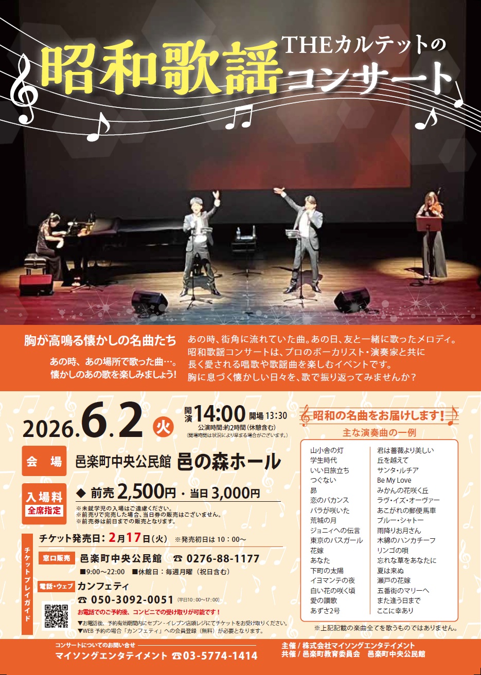 主催:株式会社マイソングエンターテイメント 共催:邑楽町教育委員会・邑楽町中央公民館 コンサートについてのお問い合わせ: |